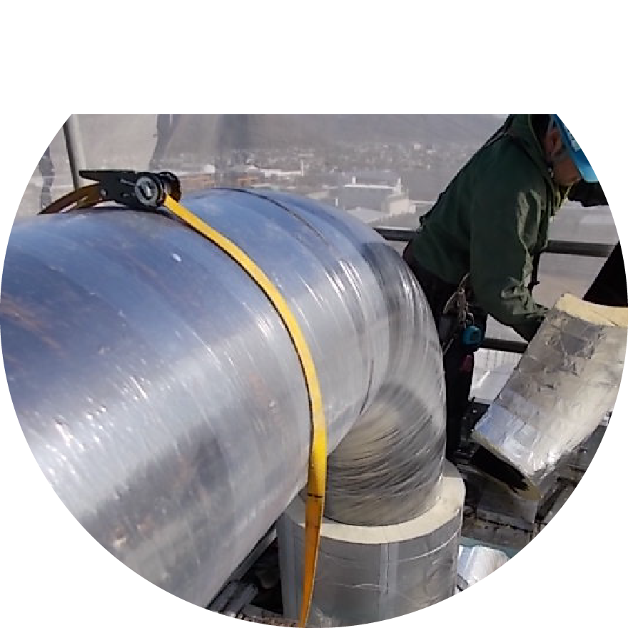 大小の差はありますが、外壁など普段は作業ができない箇所に足場を設置するために用途に応じて鋼や鉄製の足場を設置します。さらに、物の落下・飛び出しや塗料の飛散防止などのためにメッシュシートで外側を覆います。
